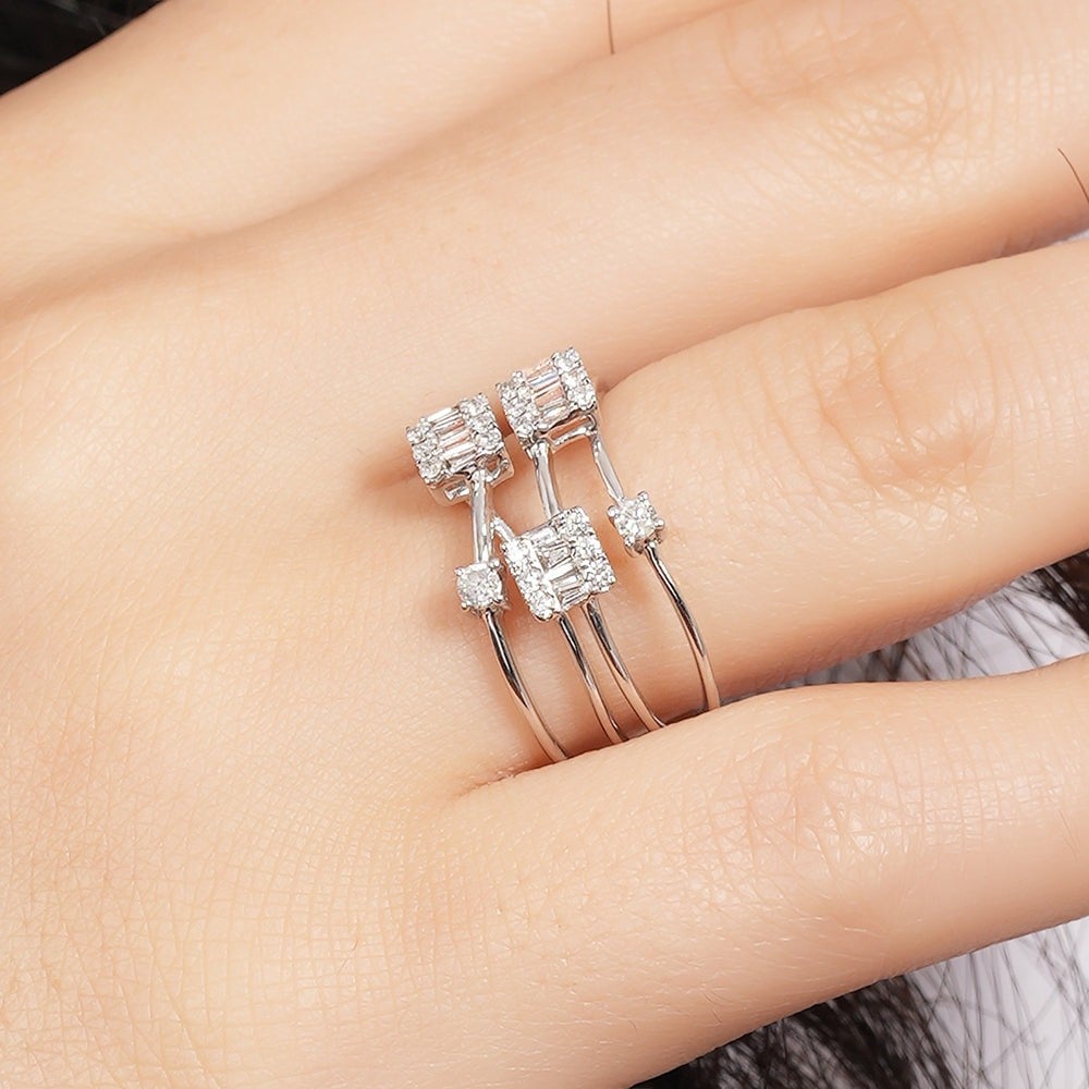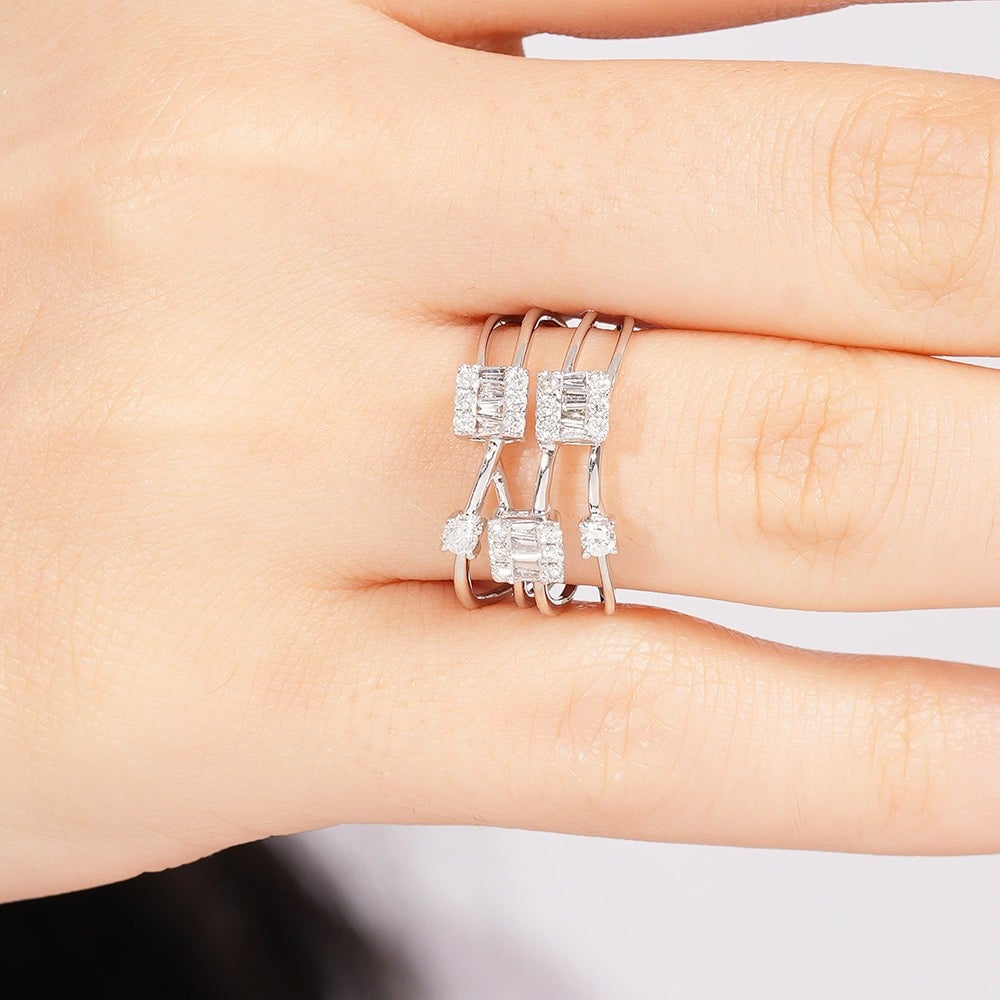 صنع هذا الخاتم خصيصا لكل امراة تحب الظهور بشكل عصري، بخطوط متداخلة من الذهب الأبيض تحمل خمسة ألماسات بقصات متميزة، مما يزين إطلالتك بأناقة لا حدود لها.