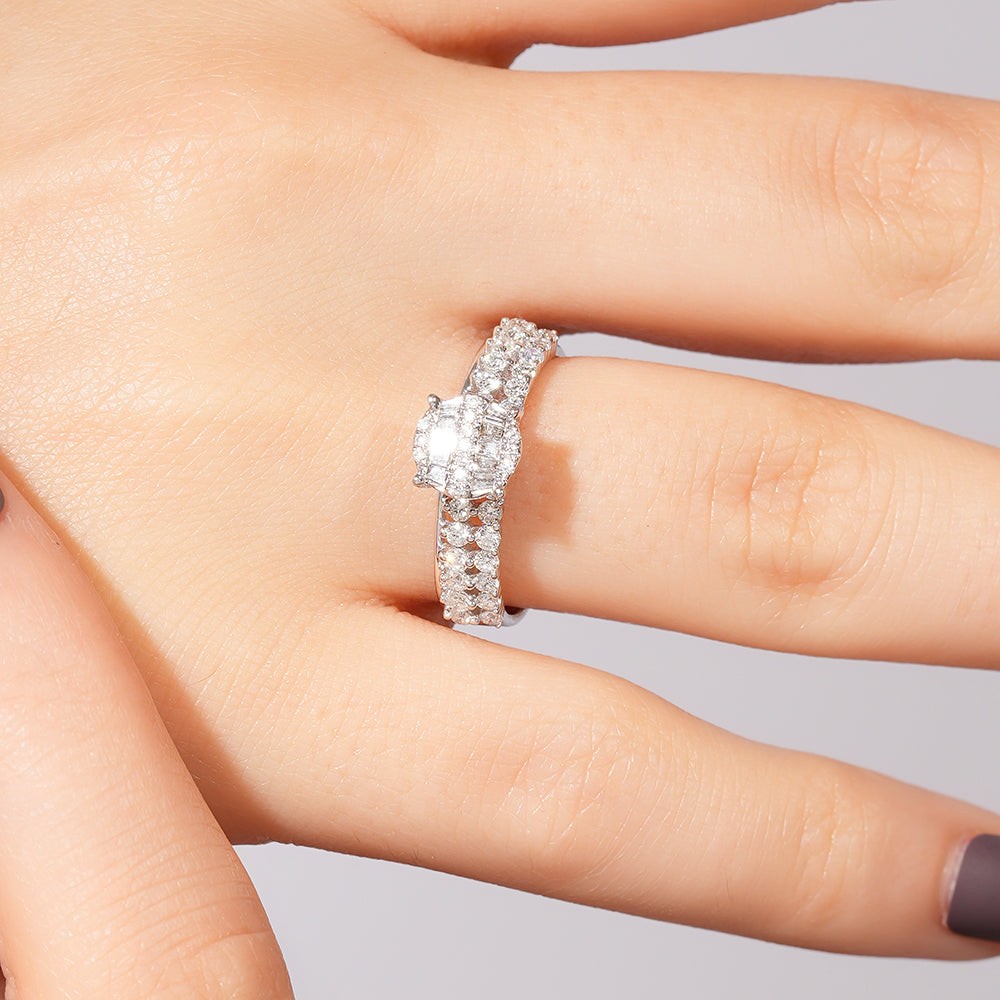 دعي هذا الخاتم يتصدر إطلالتك في يوم زفافك، فهو مرصع بالألماس بشكل فاخر يعزز من لمعانك، ويعطيك ثقة لا حدود لها.