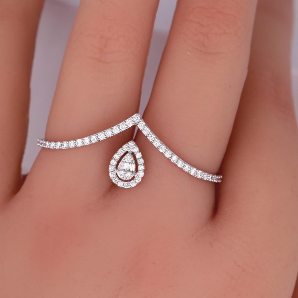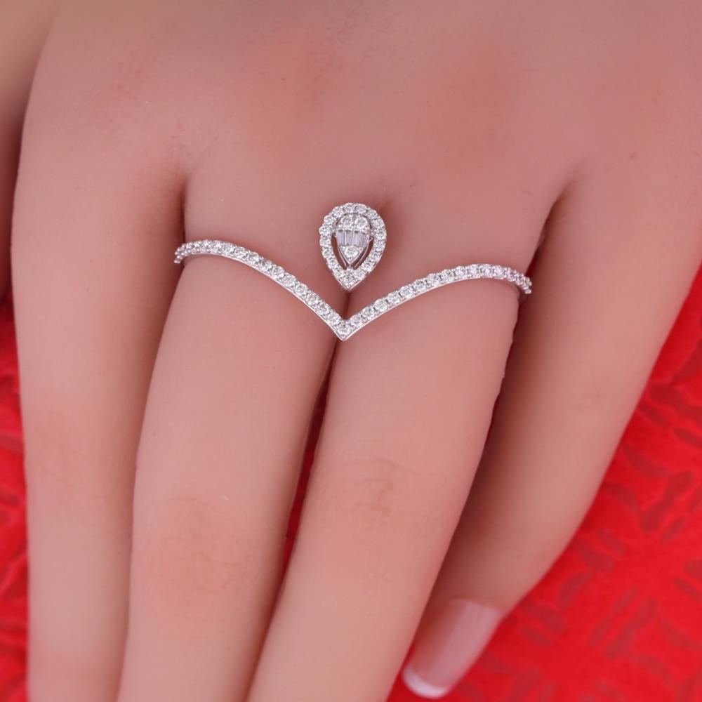 💎خاتم فريد من نوعه مُصمم لينسدل بانسيابية على إصبعين، ما يمنحه طابعًا عصريًا وجاذبية استثنائية. يتكوّن من قاعدة معدنية رفيعة من الذهب الأبيض ومرصع بالألماس ، تتصل بدائرتين مخصصتين لتُلبسا في إصبعين متجاورين، مما يحقق ثباتًا وأناقة في الوقت ذاته💍♥️