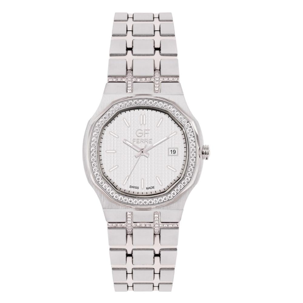 هذه الساعة ستمنحك مظهر عصري وفاخر من GF ، مصنوعة من الاستانلس ستيل بلون فضي براق، باطار مرصع باحجار الألماس و ميناء أبيض، مع عقارب فضي تجعل ساعتك فريدة من نوعها.
