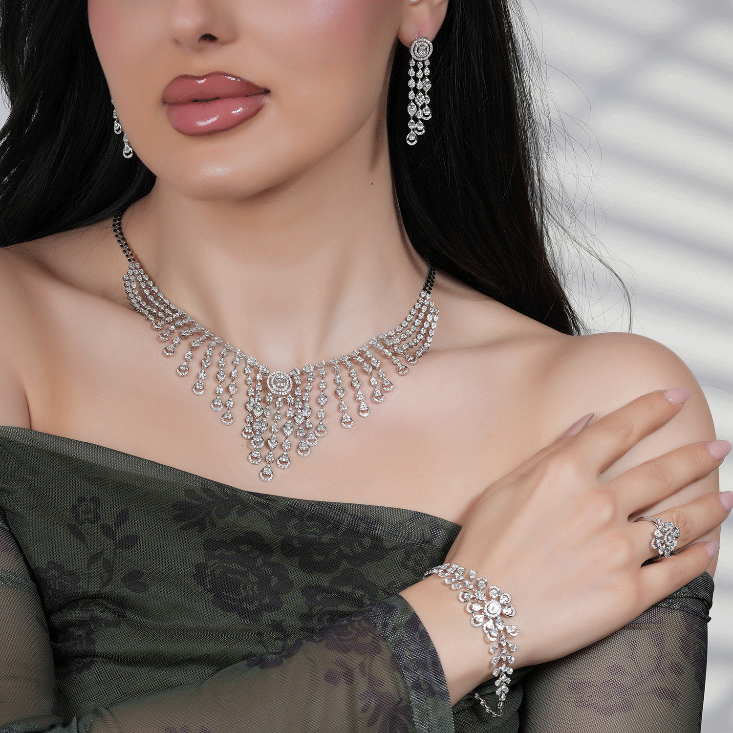 - "طقم المجوهرات هو عنوان الفخامة في أبهى صورها. 💎✨ بتصميمه المتناسق وتفاصيله المتقنة، يُضيف الطقم لمسة من الرقي إلى إطلالتك ويجعلك تتألقين بجمال خالص في كل مناسبة. ارتديه لتشعري بأنكِ نجمة هذا الحدث."