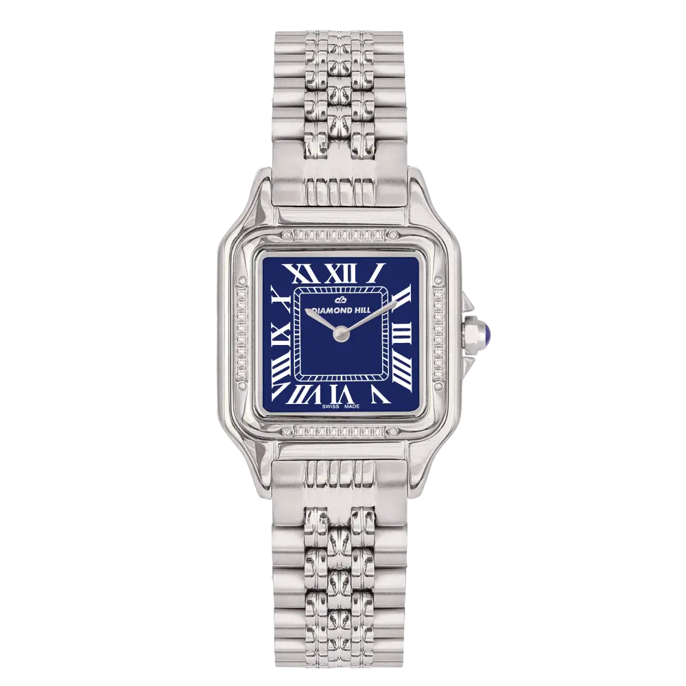 ساعة رجالية ماركة دايموند هيل صناعة سويسرية من الاستانلس ستيل المصقول بعناية ، بإطار مقاس 30 مل عرض ومع الاكتاف 40 ملم ارتفاع مزين بنقوش ترقيم روماني يمنحها كلاسيكية الساعات السويسرية